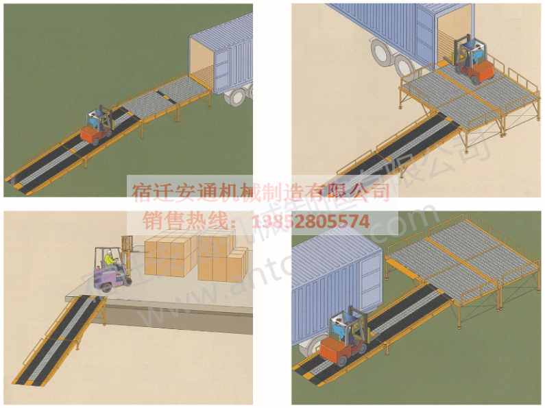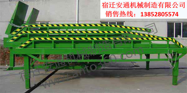 可拆式移動(dòng)登車橋是與叉車配合使用的貨物裝卸專用輔助設(shè)備。有了它,叉車能直接從地面駛?cè)肫囓噹麅?nèi)部進(jìn)行批量裝卸作業(yè)。產(chǎn)品采用人工絲桿調(diào)調(diào)節(jié),不需接動(dòng)力電源。只需單人操作,即可實(shí)現(xiàn)貨物的安全快速裝卸。它可使企業(yè)減少大量勞動(dòng)力,成倍提高裝卸作業(yè)效率,加快貨物流通速度,獲取更大經(jīng)濟(jì)效益。特別適用于作業(yè)場(chǎng)合受地方的限制,可以實(shí)現(xiàn)貨物的快速裝卸,并可以保證使用完后不占用場(chǎng)地。